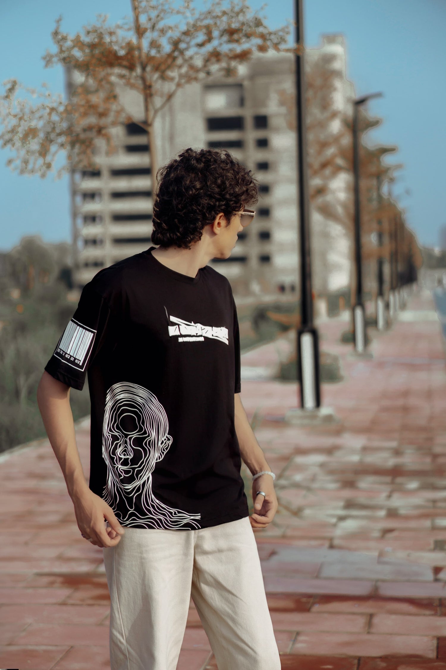 Step into the street in our oversized black graphic tee featuring a contour face print and barcode sleeve detail. Designed for those who move differently.